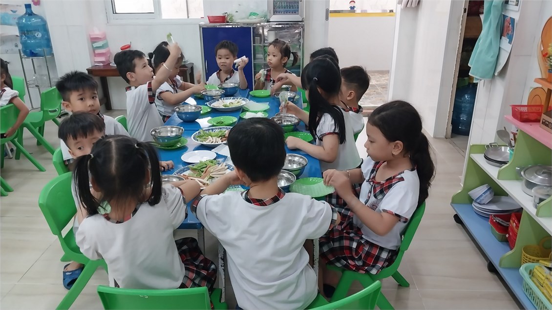 Thay đổi hình thức ăn cho trẻ giúp trẻ có những trải nghiệm là một trong những hoạt động phát triển khả năng sáng tạo, tăng khả năng lưu giữ những điều trẻ khám phá, tính năng động và thích ứng của trẻ. Đồng thời thông qua hoạt động trải nghiệm, giúp trẻ khám phá thế giới xung quanh, lĩnh hội kiến thức, biết tìm giải pháp để giải quyết vấn đề, giúp phát triển năng lực cá nhân, tăng cường sự tự tin và giúp cho việc học trở nên thú vị hơn đối với trẻ. Nhất lá nhằm giúp trẻ có những kĩ trong ăn uống, từ những nhu cầu đó, thứ sáu ngày 05/04/2024. Các bé khối chồi và khối lá cùng trải nghiệm hình thức và món ăn mới. “Bé làm bánh tráng cuộn”. Với những nguyên liệu rất gần gũi đã được các cô cấp dưỡng chuẩn bị sẵn như: Bánh tráng, xúc xích, chả lụa, dưa leo, rau salad, nước mắm...các con được làm quen với việc “tự tay” làm món ăn mà mình yêu thích khiến cho các bạn nhỏ vô cùng hào hứng và say mê. Đặc biệt với những bé không thích ăn rau nhưng hôm nay bé cũng ăn ngon và thích thú. Nhìn những đôi tay vụng về chăm chú cuốn từng bánh tráng trông mới đáng yêu làm sao. Niềm vui sáng bừng lên trên mỗi gương mặt, cảm xúc tận hưởng món ăn ngon biểu hiện trong từng động tác, biểu cảm: xuýt xoa, sờ, ngửi, nếm… của các bạn nhỏ thật đáng yêu. Các bạn nói với cô “cô ơi, ngon quá! Mai cô làm tiếp nha” Thấy con vui, hạnh phúc, lòng cô cũng vui và hạnh phúc theo. Mong sao con mỗi ngày một lớn khôn, vui và hạnh phúc đó cũng chính là niềm vui và hạnh phúc của cô.